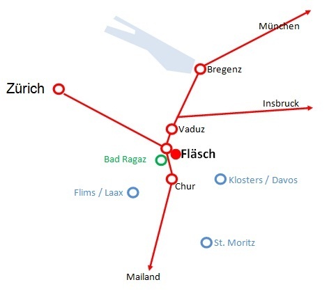 Die Talstation des Familienskigebietes Bad Ragaz Pizol ist mit dem Auto in 10 inuten erreicht. Aber auch die grossen und weltweit bestens bekannten Skigebiete Davos Klosters, Lenzerheide Valbella und Flims Laax, sind in weniger als 1 Autostunde erreichbar. St. Moritz und Arosa liegt ebenfalls in unserem Tages-Einzugsgebiet.