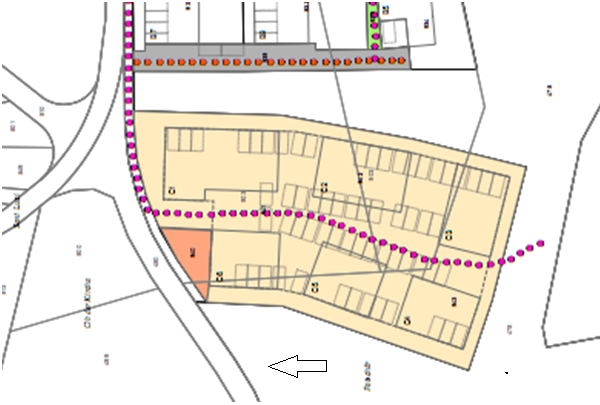 Die motorisierte Erschliessung erfolgt über die mit Liften eingebundene Tiefgarage. Über das Terrain sind Fusswege geplant. Die vordere und hintere Häuserzeile bilden einen Innenhof und sind gegen Aussen von Wiesland umgeben.